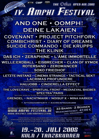 Nach dem Fest ist bekanntlich vor dem Fest. Und so drehen sich die Mühlen hinter den Kulissen des Amphi Festivals bereits auf vollen Touren, für die vierte Auflage des beliebten Szene-Open-Airs. Am 19. und 20. Juli 2008 dreht sich im Kölner Tanzbrunnen wieder alles um Eletronik, Industrial, Mittelalter und schwarze Romantik, mit dem musikalsichen Großaufgebot aus 32 Bands auf zwei Bühnen.