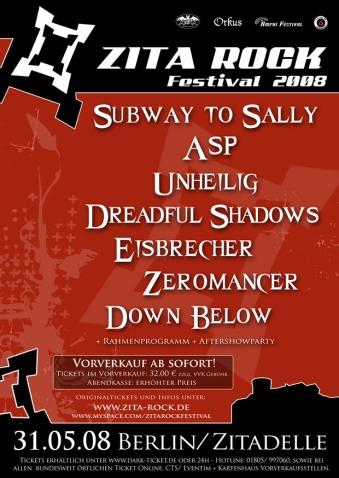 Der Wanderpokal für die schnellste Festivalorganisation der kommenden Saison geht in diesem Jahr an das Zita-Rock Festival in Berlin. Flotte 10 Monate vor Beginn, offenbarte das Festivalteam bereits sein komplettes Lineup inklusive Timetable. Nach der erfolgreichen Premiere mit Marilyn Manson als Headliner, steigt das zweite Zita-Rock Festival am 31.05.2008 in der Zitadelle Berlin-Spandau mit folgendem Lineup: